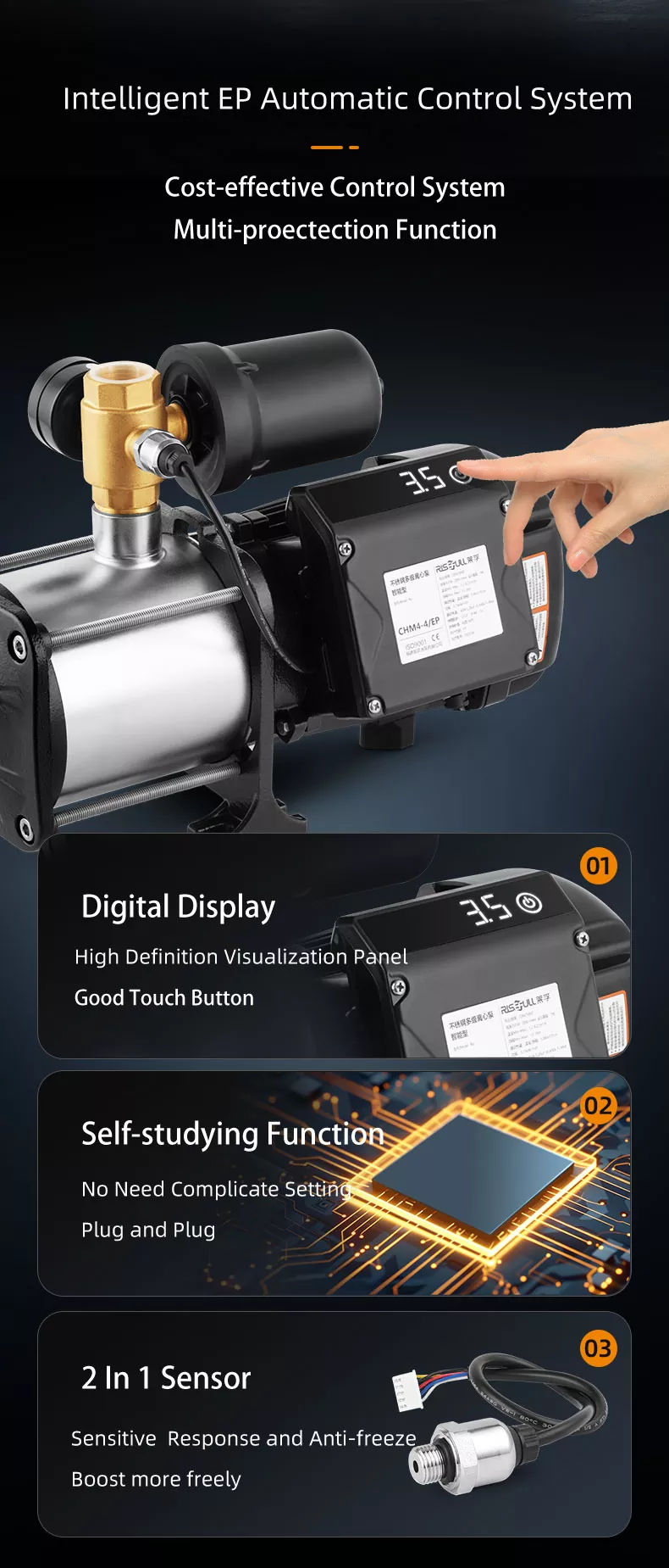 | CHM2-6/EP | 0.75 | 4.6 | 60 | 2m³/h@47m | 6 | 383x189x266 | 15.6 |