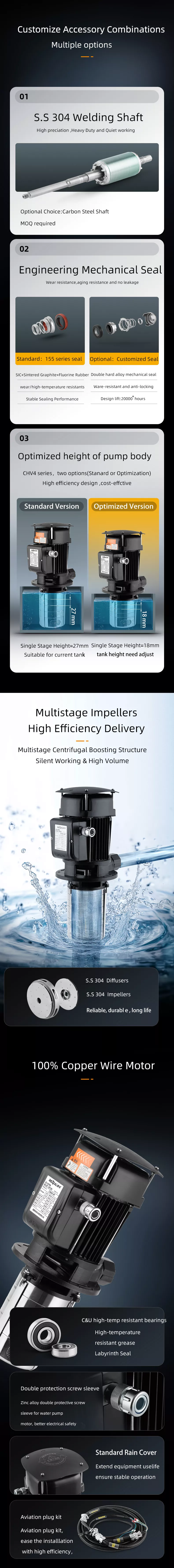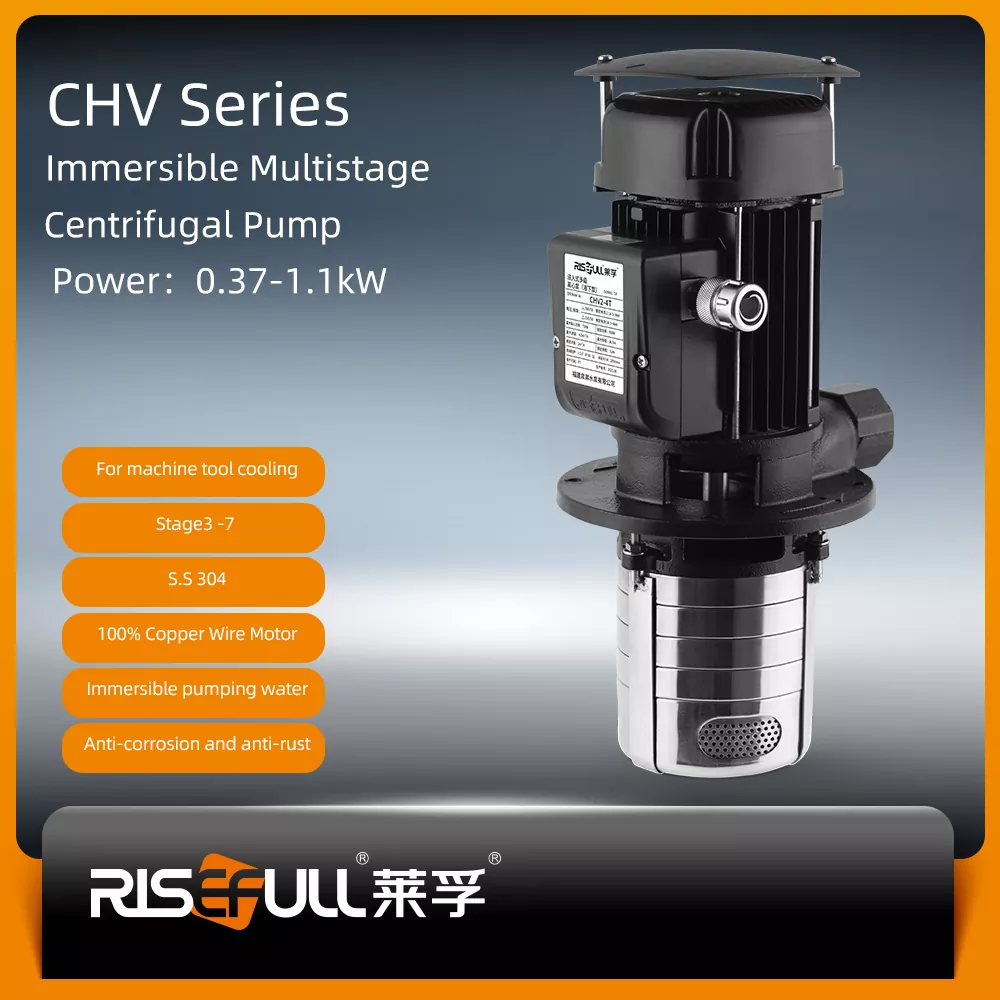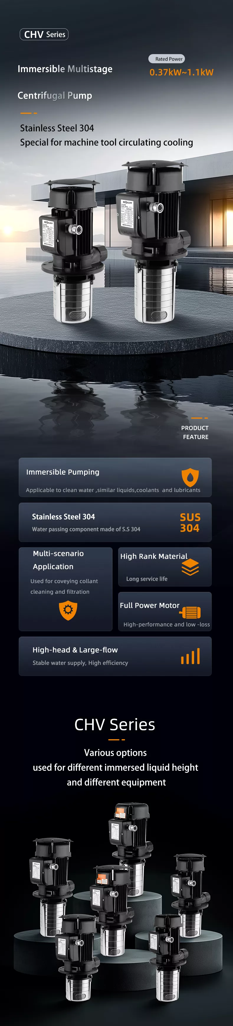 Следното е вовед во серијата CHV Потопната повеќестепена центрифугална пумпа CHV, позната и како потопена пумпа или машинска пумпа, се користи за пренесување на течноста за ладење, лубрикант, пренос на вода кондензат, опрема за индустриско чистење, системи за филтрирање и други апликации погодни за употреба на потопена пумпа. Тој е идеален за интеграција со машински алати, машини за брусење, центри за обработка со CNC, EDM машини, машини за индустриско чистење и друга опрема.