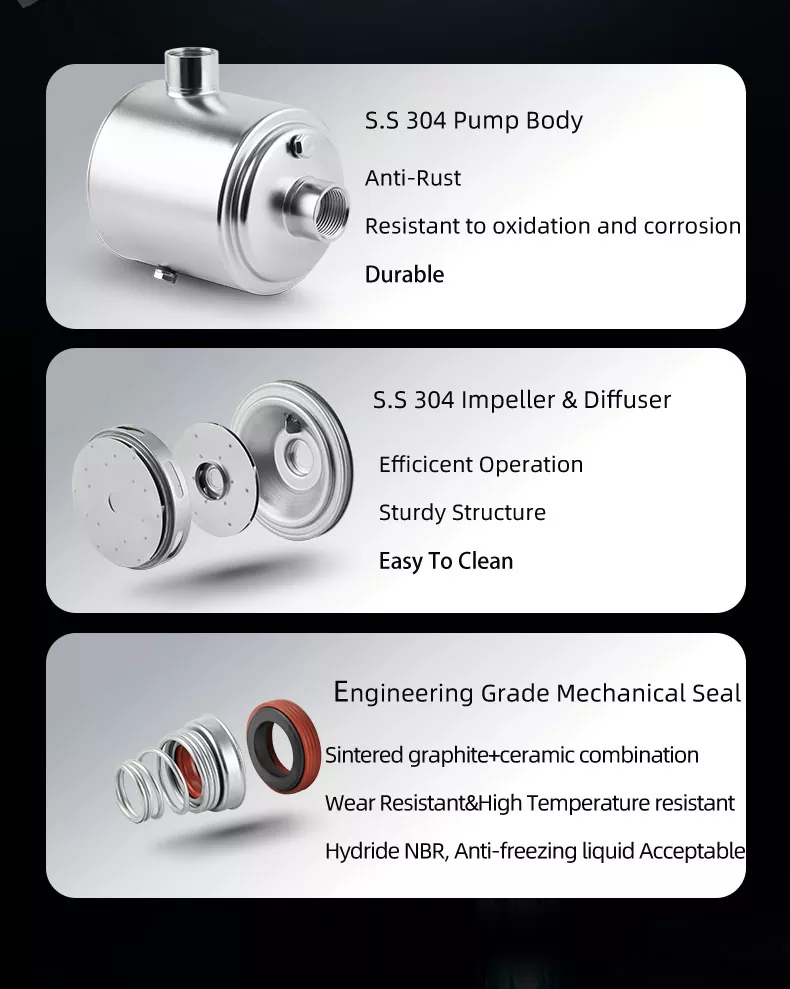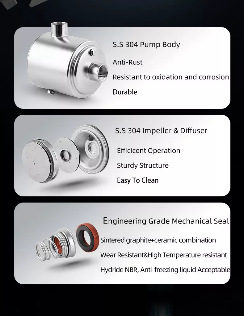 Разновидни апликации: Од станбени системи за вода до земјоделско наводнување и индустриски процеси, оваа пумпа е доволно разноврсна за да се справи со сето тоа. Неговиот излез со висок притисок го прави погоден за разни поставки, обезбедувајќи ви сигурно решение за вашите потреби за пумпање.