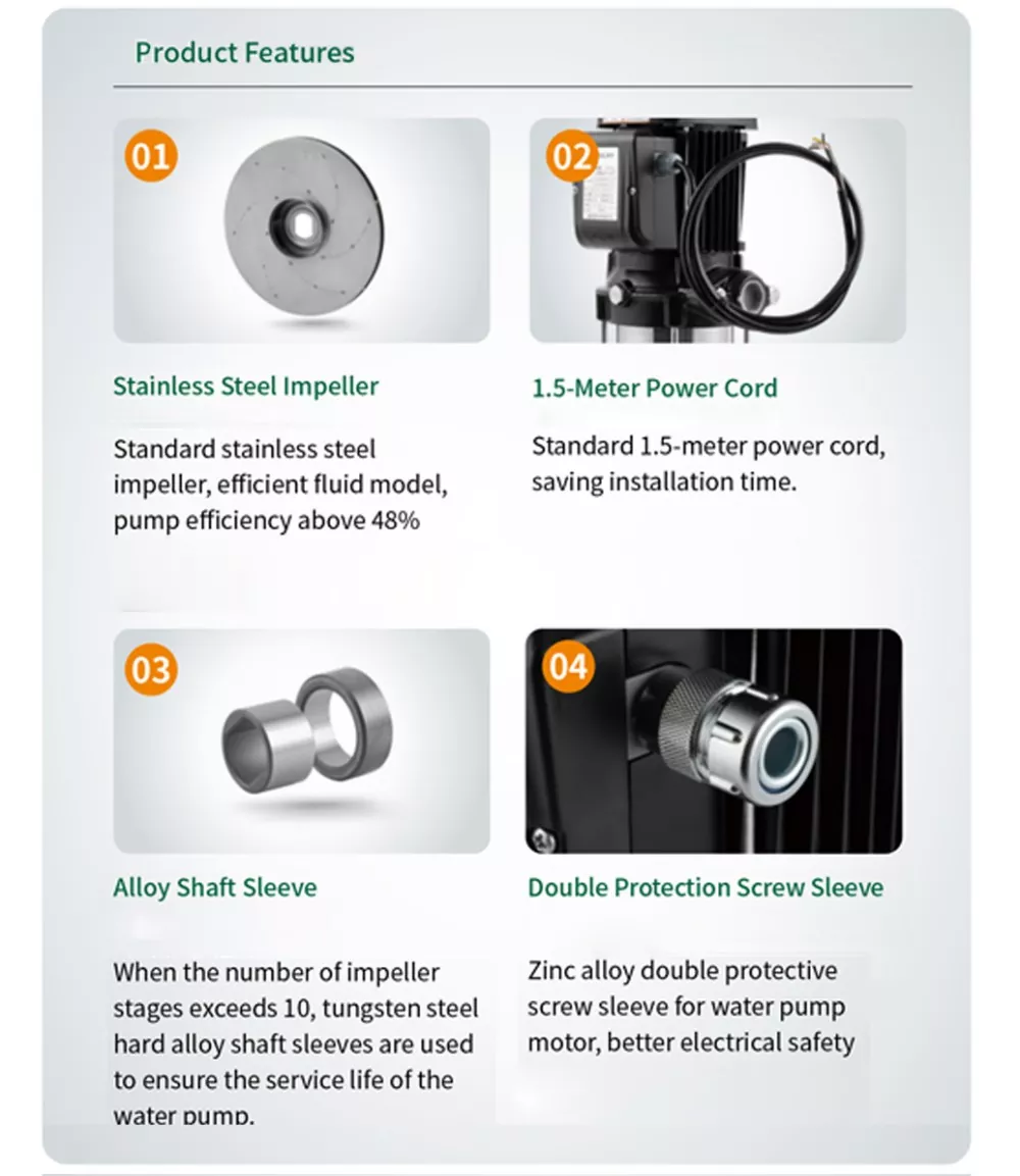 · Механичките заптивки направени од тврда легура + флуорна гума го намалуваат истекувањето и потрошувачката на енергија, обезбедувајќи непречено и тивко работење.
